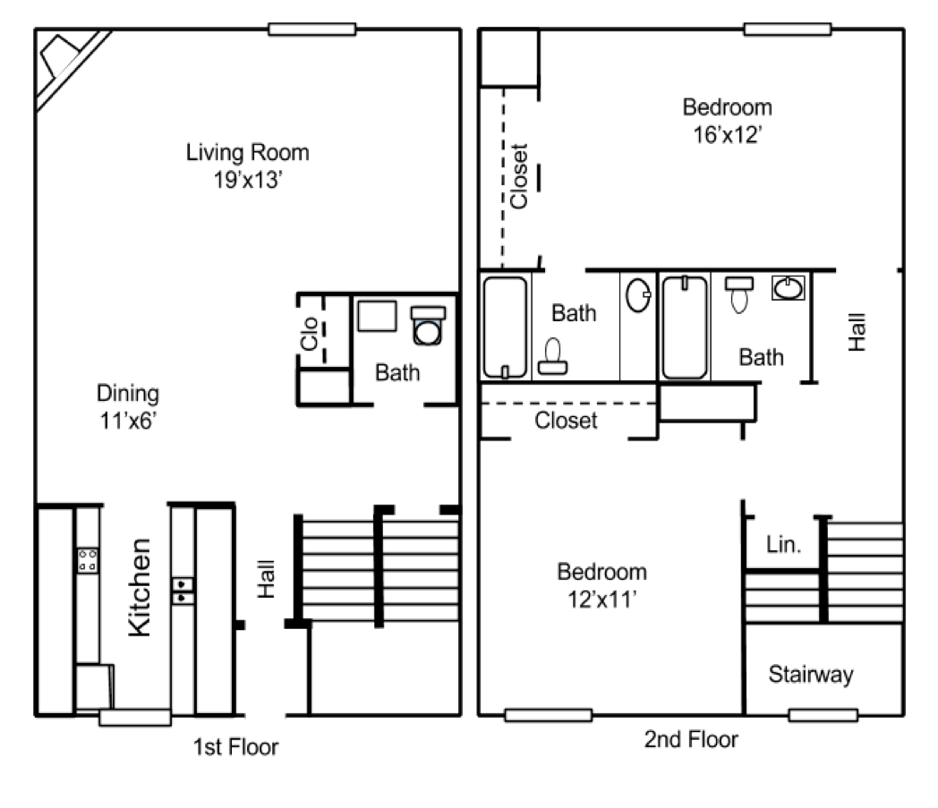 This is our two bedroom, three bathroom townhome floorplan with 1,280 square feet of living space. Please call a member of our friendly leasing staff for more information!